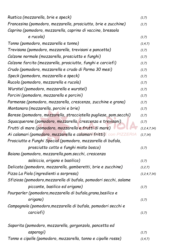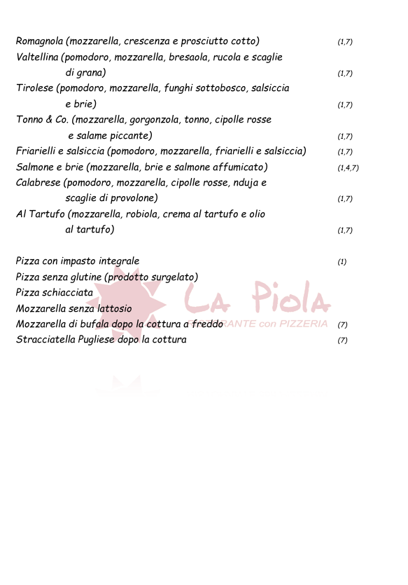 La Piola è una pizzeria con forno a legna che offre la possibilità ai propri clienti di assaporare ottime pizze comodamente seduti all'interno delle luminosissime sale o nell’ampio dehors esterno.